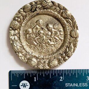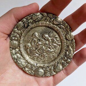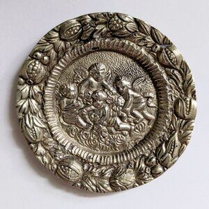 Charming vintage Italian silver-plated decorative plate featuring a beautifully detailed repoussé design of cherubs surrounded by fruit and foliage.