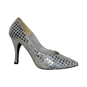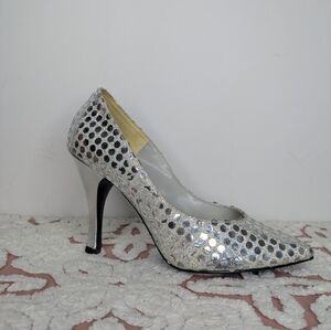 Shine all night in these vintage silver high heels covered in dazzling sequin discs. With a sleek pointed toe and a classic stiletto silhouette, these pumps are made for the dance floor. Perfect for parties, NYE, bachelorette nights, or any occasion that needs a little sparkle. Lightweight and eye-catching, they’re the ultimate retro-glam accessory.