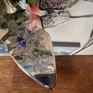 A beautiful vintage holiday-themed serving set featuring a silver-tone cake or pie server etched with "Christmas Greetings" and poinsettias, paired with a matching set of ornate pastry tongs in an elegant scroll design. These timeless tools bring both charm and function to your festive dessert table or tea service display.