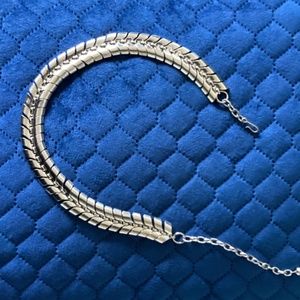 This is a vintage, silver tone choker necklace and is adjustable. To me, this metal could be stainless steel but I have no history on the piece. It’s quite shiny though and has no sign of tarnish. Very pretty!