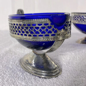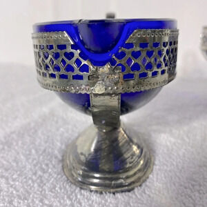 Vintage Silver Tone Pedestal Cobalt Blue Glass Royal Sapphire Cream & Sugar Set