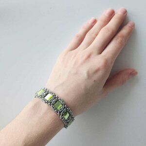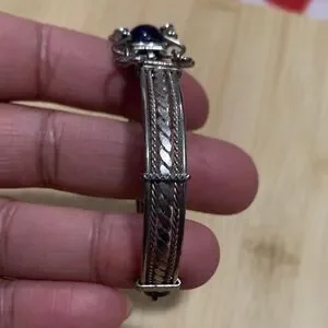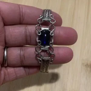 This stunning vintage bracelet features a deep blue glass stone set in elegant silver. Perfect for adding a touch of sophistication to any outfit.