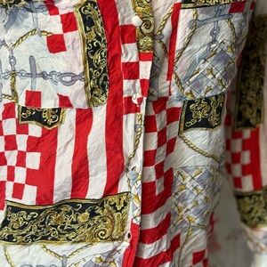 Stylish women's blouse featuring a vibrant red and black pattern. Perfect for adding a bold touch to your wardrobe.