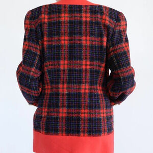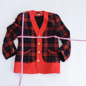 Channel vintage glamour with the timeless appeal of the Vintage Simon Chang Black & Red Pattern 88% Wool Button Down Shoulder Pad Blazer.