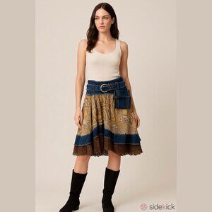 Embrace a unique style with this denim skirt. Featuring a blend of blue and brown tones, this skirt is perfect for a casual day out. The fun and whimsical design is perfect for playing dress up or as an every day staple.