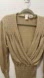 Shimmering vintage knit from Simpsons, the iconic Canadian department store. Features a metallic gold finish, deep surplice crossover neckline, pleated shoulder details, and ribbed waist for a flattering silhouette.