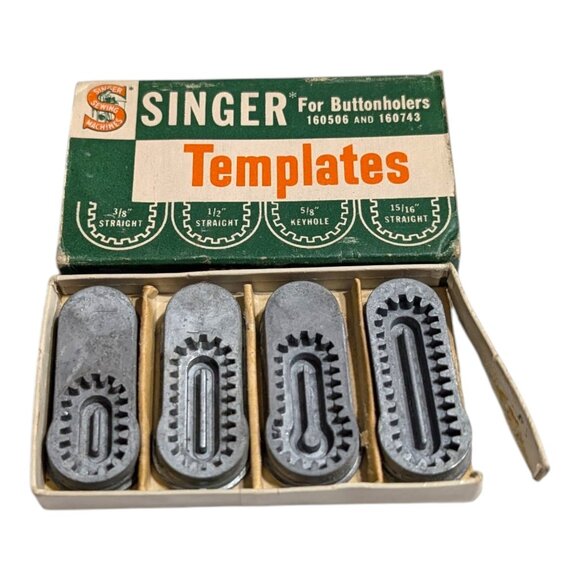 Description:This is a vintage set of Singer 160668 sewing machine templates for buttonholers. The set includes the original 3/8" straight, 5/8" keyhole, and 15/16" straight templates. Please note, the original 1/2" straight template has been replaced with an 5/8" straight template.