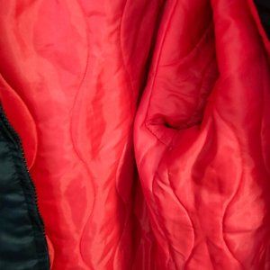 EUC. Vintage Ski Doo lightweight men's jacket in black with the signature yellow and orange from the shoulder to under the armpit. Red quilted interior