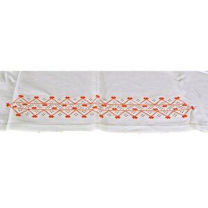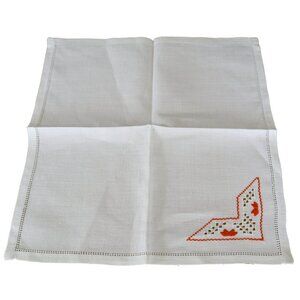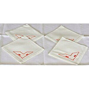 The tabelcloth measures 35.5" x 34.5" and the napkins measure 11.5" x 12" and the embroidery is an red/orange colour.
