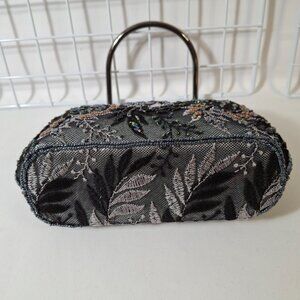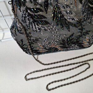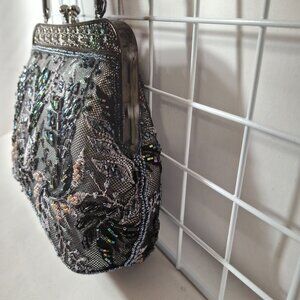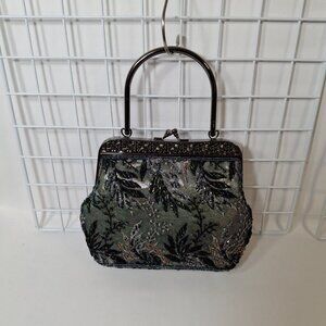Vintage Small Tapestry Beaded Evening Purse Metal Top Handle, Crossbody Chain