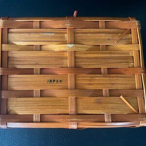 Vintage Small Woven Basket (Japan) . Excellent vintage condition.(7.5" x 5.5") approx. Stamped Japan. Closure loop does not line up as shown in pics. Still opens and closes as it should. Perfect for trinkets/jewellry or sewing supplies.