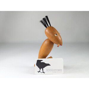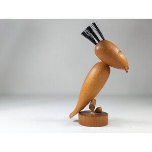 A fantastic vintage wooden bird bottle opener, with a bristle hair mohawk and a little cigarette poking out of the side of his mouth. The styling is very Scandinavian, but the base is marked "Japan". It is possibly not the original base as the bird sits quite loosely on top of the perch, but size and colour-wise they fit well together. ca 1960s - 1970s.
