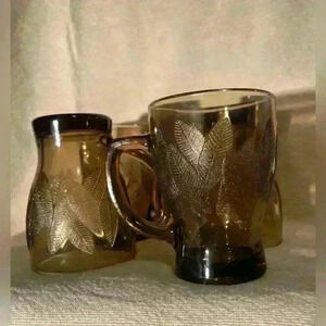 Vintage Smoky Brown Taupe Indonesia KIG Leaf Pattern Glass Coffee Mugs (4)