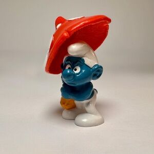 Adorable vintage Smurf figurine carrying a red toadstool mushroom.