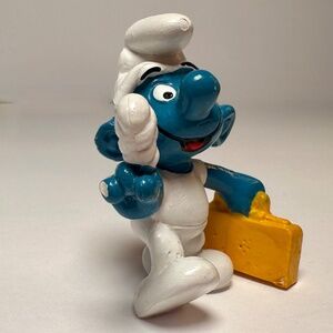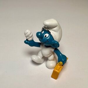 Adorable vintage Smurf with a bandaged (sore) thumb, carrying a yellow case — a charming and slightly less common character pose that collectors love for its quirky detail.
