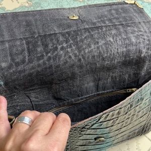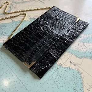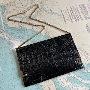 Vintage snakeskin bag with gold chain strap and corner accents. Very cool vintage piece, no tag indicating maker or materials used. Shows some wear - see photos for details. Measures 11" wide, 7" tall.
