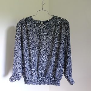 Vintage Snow Leopard Print Blouse with Shoulder Pads and Shirred Hem Size Large