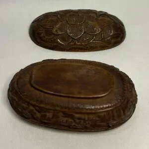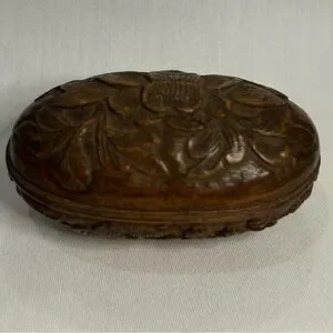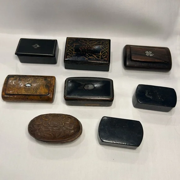 Collection of Vintage Snuff Boxes. Carved box is a rare Coquilla Nut. All in good condition with working lids / hinges.