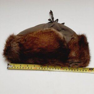 • Vintage genuine soft muskrat fur winter hat in brown and grey/green fabric combo.