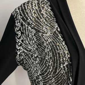 Open silver/white and black embroidered lace body with solid black shawl collar and 3/4 length sleeves.