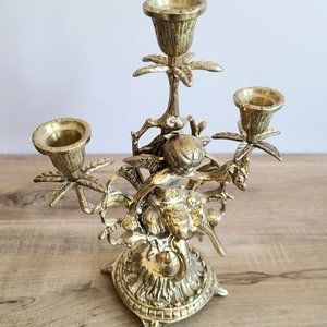 Vintage Solid Brass Candleholder candelabra with Cherub Figure. 12'' tall, 8 1/4'' wide. Very heavy. Shows some patina. Good vintage condition.