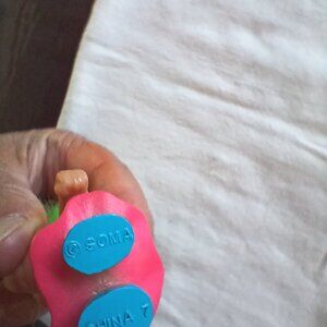 One has green hair in pink dress, white t-shirt, blue shoes. Superhero troll has yellow hair, green cape, black body with some blue. Very good condition.