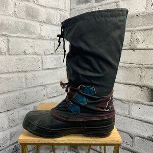 Embrace the nostalgia of the 80s and 90s with these vintage Sorel Kaufman Freestyle, a harmonious blend of retro style and modern functionality. These knee-high snow boots are an essential for anyone seeking a blend of comfort and style during the chillier months. The vibrant black blue purple colorblock design, complemented by the iconic Sorel Freestyle logo accent, offers a bold fashion statement that doesn't sacrifice warmth or waterproofing. Crafted with a durable nylon upper and a comfortable synthetic insole, these boots are designed to keep your feet snug and dry. The lace-up closure ensures a secure fit, while the robust rubber outsole provides excellent traction. Ideal for a variety of occasions, from casual wear to outdoor adventures, these boots are a testament to classic design and Canadian manufacturing quality.