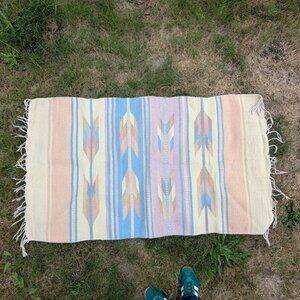A small area rug in pastel colours, in a Southwestern style. It looks handmade, possibly in a cotton or cotton mix. In good condition with small marks of age and use, mostly to the little end tassels.