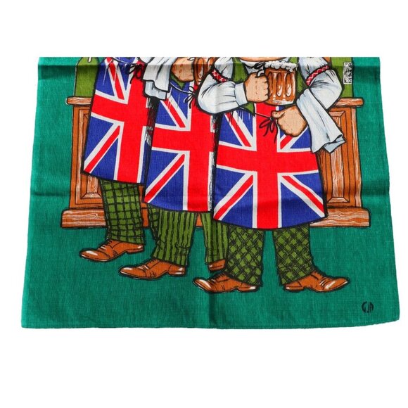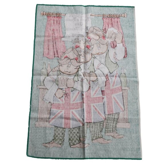 For your consideration is a vintage souvenir Tea Towel featuring Britsh barmen giving a toast to her Majesty, circa 1970s.