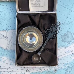 Vintage Soviet era salt cellar with spoon in box. Beautiful metalwork - I believe it's silver but I can't confirm 100% - see photos for details. Box measures 5" x 3.75" x 1.75".