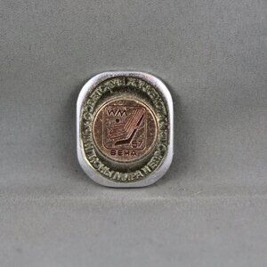 Up for sale is a vintage soviet hockey pin. It has a silver base colour with a brown middle section. The silver portion of the pin has Soviet hockey world champions stamped in. The middle of the pin has the official logo for the 1967 World Hockey Championship stamped in. What a great addition to any hockey collection.