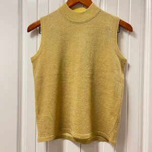 This vintage sleeveless knit top features a beautiful gold-yellow tone with a subtle metallic sheen. The mock neck design adds a sophisticated touch, making it easy to dress up or down. Lightweight and comfortable with a timeless silhouette—perfect for layering or wearing on its own.