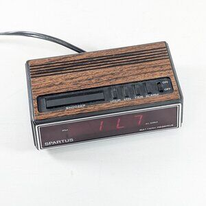 A vintage SPARTUS radio alarm clock with a faux wood top - it looks fine when you look at it, but NOT so fine when trying to capture the photos or video.....? Part of the red digits seem to vanish, but when you simply look at it.....it all looks fine??