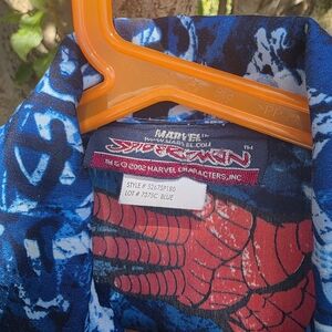 Vibrant Spiderman design. Blue background with red accents. Button down style. Perfect for fans.