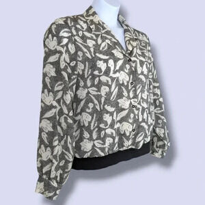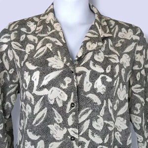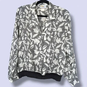 This vintage blouse by Elite International features a polyester fabric with a stippled black and white floral pattern. It also has a front button closure, buttoned cuffs, a bottom elastic, and shoulder pads.