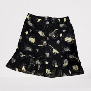 Vintage floral fitted skirt with ruffle trim at the bottom. The skirt itself is black, and the floral pattern is white, yellow and grey.