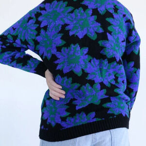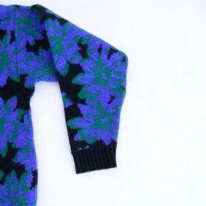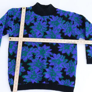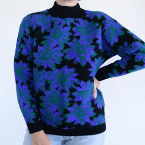 Vintage Spunky Black Purple & Green Floral Shimmer MockNeck Sweater Festive L