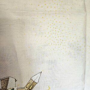Vintage square tablecloth in cream coloured cotton fabric with scalloped edges, printed winter design of houses, church and tree. Christmas or winter holiday themed. For a small table, measures 28" by 29.5".