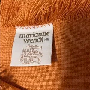 Vintage Marianne Wendt Rust Woven Square All Occasions Tablecloth. Ethnic pattern, fringe edging on all sides.