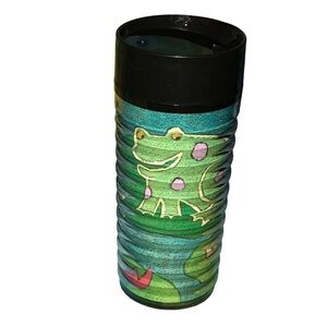 This vintage Starbucks 1999 ribbed coffee tumbler with its adorable frogs and water lilies is in good preloved condition for its age. There are some marks on outside of lid from normal wear. Please see pics for overall condition. Thermo-Serv double wall construction and screw on lid. Designed by Nancy Coffelt and made in the USA.