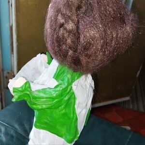 This is an interesting hand-made doll. Vintage. Entire doll minus hair is starched. Apron can hold small items. Sweet face. Stand-alone. Doll lovers can add to your collection. White dress, green apron. Stands approx 13" tall.