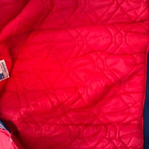 Great vintage Starter jacket. Very vibrant red color.Item is in used condition review pictures for condition. 2 snags on left arm, two barely visible small marks on left sleeve. One small snag in back above elastic. Size is medium. It is a bomber fit so fits a little higher than newer jackets.