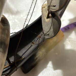 Enhance your home decor with this elegant brown and cream decorative ship figurine. Its intricate design adds a touch of sophistication to any room. Unfortunately the base is uneven and will need to be propped up on something. A couple of the wires are loose.