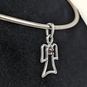 This vintage pendant is made of sterling silver and is shaped like the outline of an angel. The angel is holding a small faceted red/purple glass stone. The bail is attached at the top of the angel's head and is stamped 92500 on the back. The pendant has signs of wear, but it is in good condition overall.