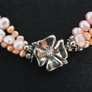Vintage Sterling Silver 3-Strand Pink & Orange Pearl Necklace with Flower Clasp