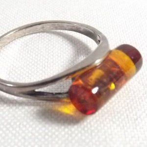 Vintage Sterling Silver 925 Marked Ring with Amber Cylinder, Size 8