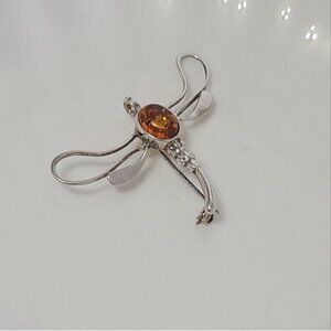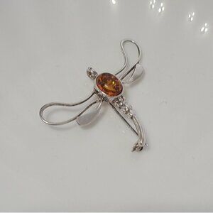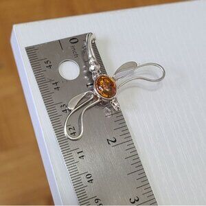 Vintage Sterling Silver Baltic Amber Gemstone Dragonfly Brooch Pendant
