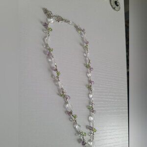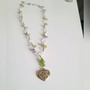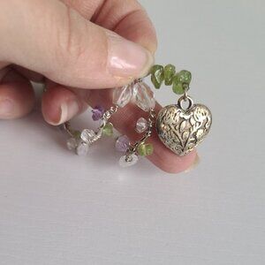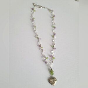 Vintage Sterling Silver Engraved Heart Purple Green Crystal Beaded Necklace