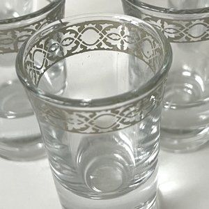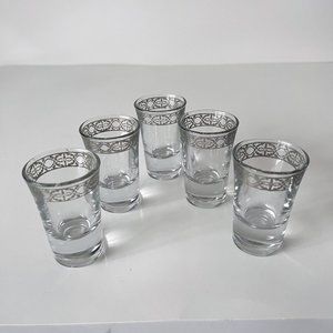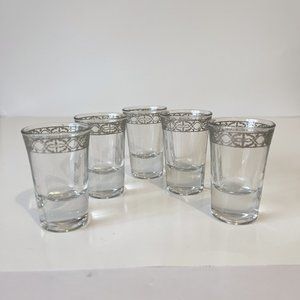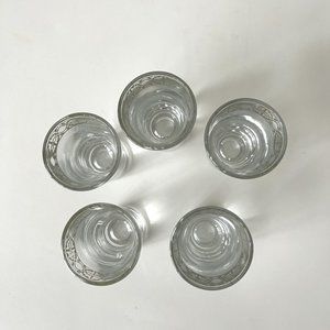 Incredible vintage shot glasses, featuring five shot glasses adorned with exquisite sterling silver overlay. These shot glasses boast a substantial base, and the sterling silver detailing extends to the rim, enhancing their elegance. The classical sterling silver pattern overlay frieze adds a touch of sophistication to every sip.