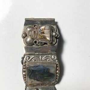 Vintage Sterling Silver Panel Bracelet Abalone Aztec Taxco Mexico Eagle Head